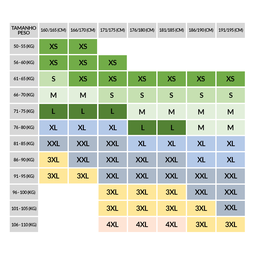 Confira a tabela de tamanhos e indicativa de peso e altura