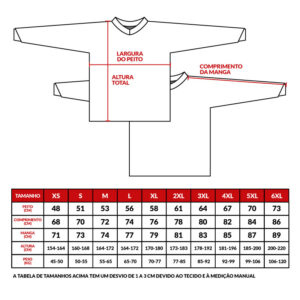 | Tamanho | XS, S, M, L, XL, 2XL, 3XL, 4XL, 5XL, 6XL |