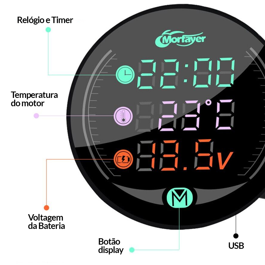 Esse incrível painel auxiliar é um incremento ótimo de tecnologia para qualquer motocicleta. Ele oferece um relógio auxiliar com marcador de timer, marcação da tensão da bateria, marcação da temperatura do motor e um USB.