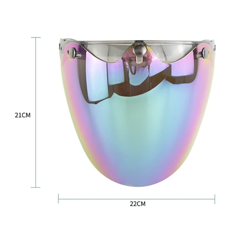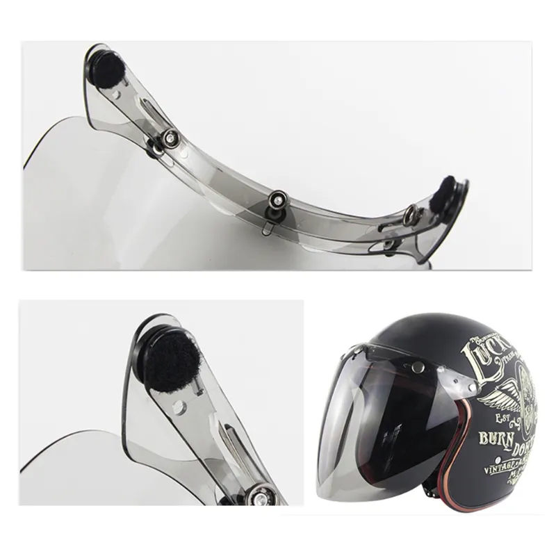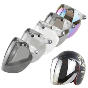 A viseira é resistente a riscos e possui proteção UV. Disponível em uma variedade de cores é adequada para homens ou mulheres e serve para a maioria dos capacetes retro com 3 botões.